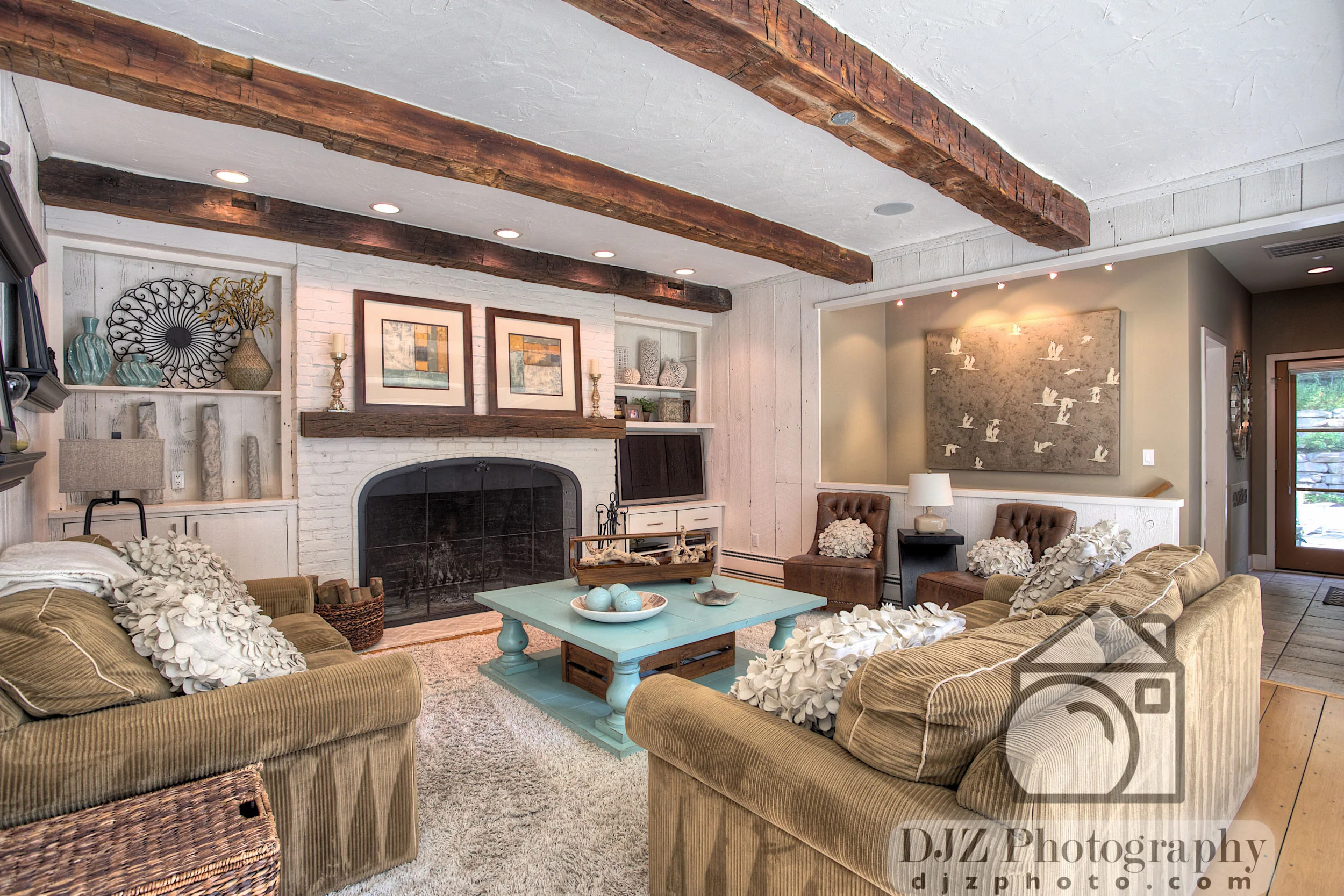 Extra wide wood burning fireplace, distressed wood walls, built in cabinets and shelves, rough dark wood ceiling beams, built in speakers and recessed lighting.